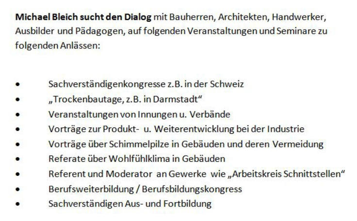 Alle Vorträge berichten aus der Sachverständigen Praxis des öffentlich bestellten und vereidigten Sachverständigen Michael Bleich. Diese Vorträge dienen der Vermeidung von Bauschäden. Keine Verkaufsveranstaltungen sondern echte reale anonymisierte Fälle aus dem Sachverständigen Alltag. In der Regel sind diese Seminare kostenfrei, und dienen dem Dialog zwischen Handwerker, Produkthersteller, Architekten, Ausbilder, Bauleiter und Fachbetriebe.