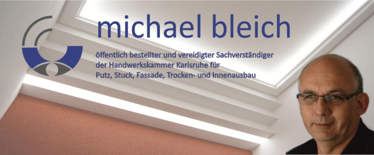 Michael Bleich ist öffentlich bestellt und vereidigt für das Suckateurhandwerk (Ausbau und Fassade) von der HWK Karlsruhe (Aufsichtbehörde)